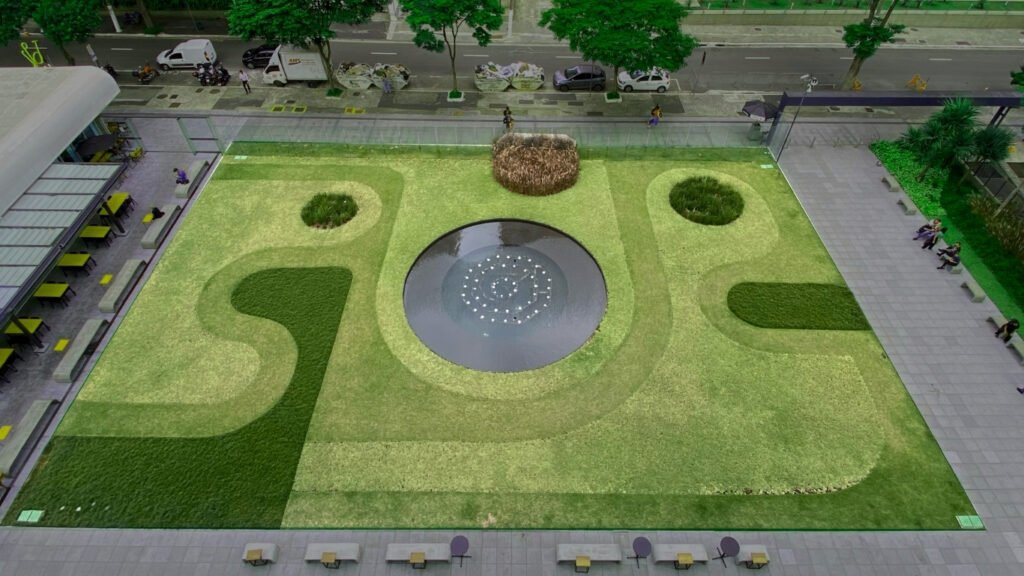 O desenho do jardim é marcado por faixas de grama em dois tons, uma grama rara, com verde mais claro, e outra, com verde mais escuro, que formam curvas contínuas ao redor do espelho d’água central. Visto de cima, o recorte do gramado lembra um grafismo orgânico, quase como um símbolo construído no chão. No centro, a fonte circular, com pontos distribuídos em espiral, faz cenografias de água com a fonte.